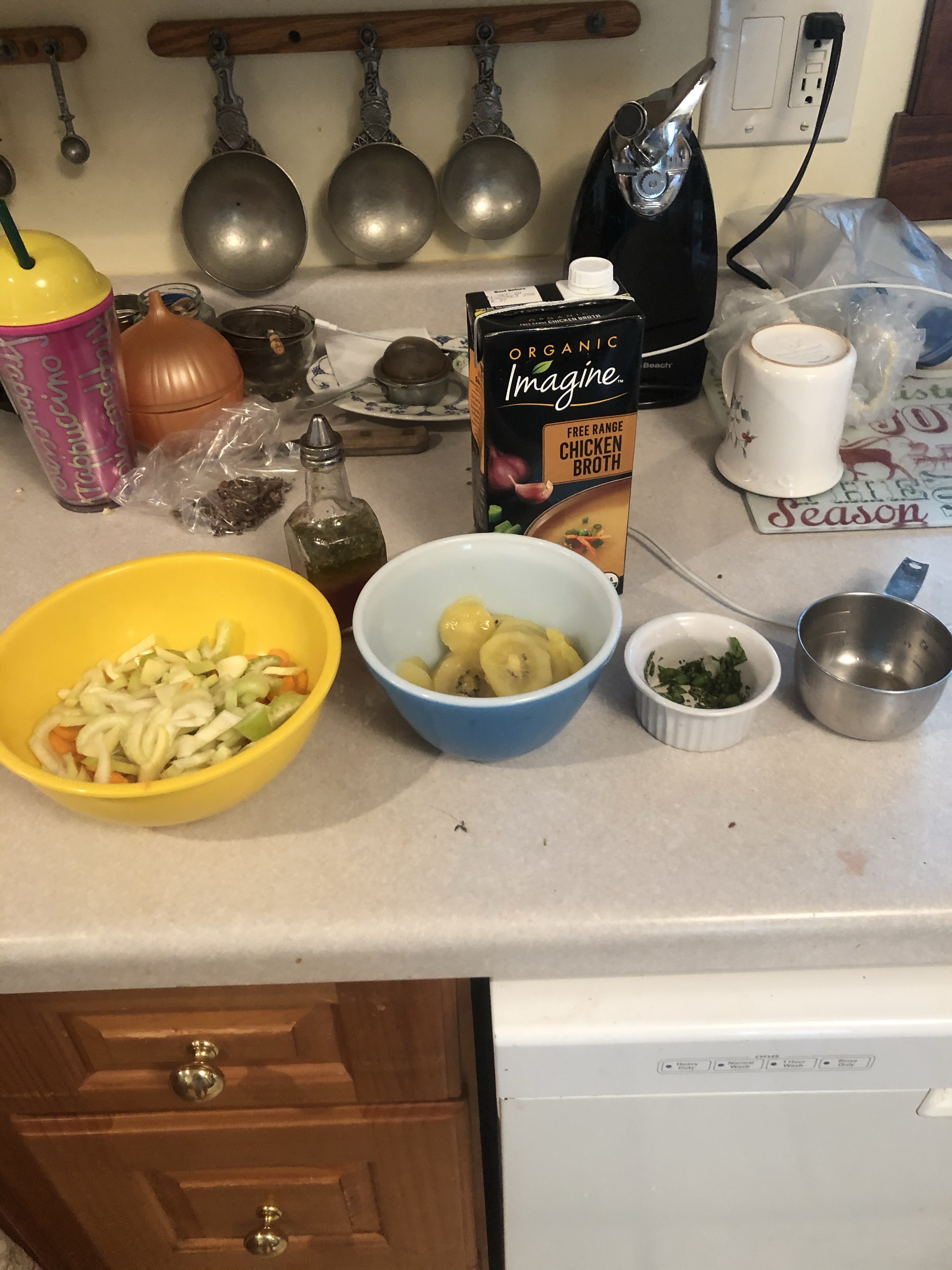 Here’s the leftover 10 vegetable soup since I forgot to post the final picture yesterday. As most soups go, it was even better the second day. The only issue I had with this is that I didn’t understand the directions on the recipe that said 3 cups chopped green cabbage quartered. I thought you can’t have both chopped and quartered so I just quartered it, but had to cut into smaller pieces once it started cooking.